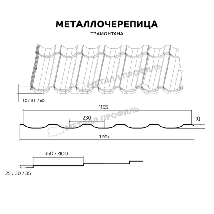 Новый профиль металлочерепицы от Компании Металл Профиль. Благодаря усиленной геометрии материал не чувствителен к ветровым нагрузкам и подходит для эксплуатации даже в самых неблагоприятных климатических условиях. Большая глубина профиля (50/55/60 мм на выбор) в сочетании со срезанным гребнем волны выделяют эту металлочерепицу на фоне других. Помимо прочих плюсов новинки, стоит отметить её 100% герметичность. Это возможно благодаря оптимизированной конструкции бокового замка — усиленный капиллярный жёлоб не позволяет воде попасть под кровлю. Эту же задачу решает и хорошая стыковка листов, изготовленных на высокоточном европейском оборудовании. Горизонтальные соединения черепицы с профилем ТРАМОНТАНА незаметны невооруженным глазом за счёт 3D-реза нижней кромки листов. Новый профиль производится с полимерными покрытиями сегментов Премьер и Премиум в линейке Компании Металл Профиль. Покрытия имеют разнообразную цветовую палитру, включая оттенки «металлик», а кроме того, впечатляющие технические параметры, которые обеспечат вам крепкую крышу на несколько десятилетий*.